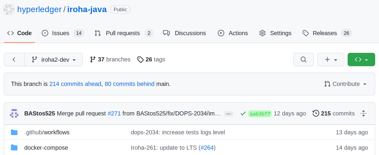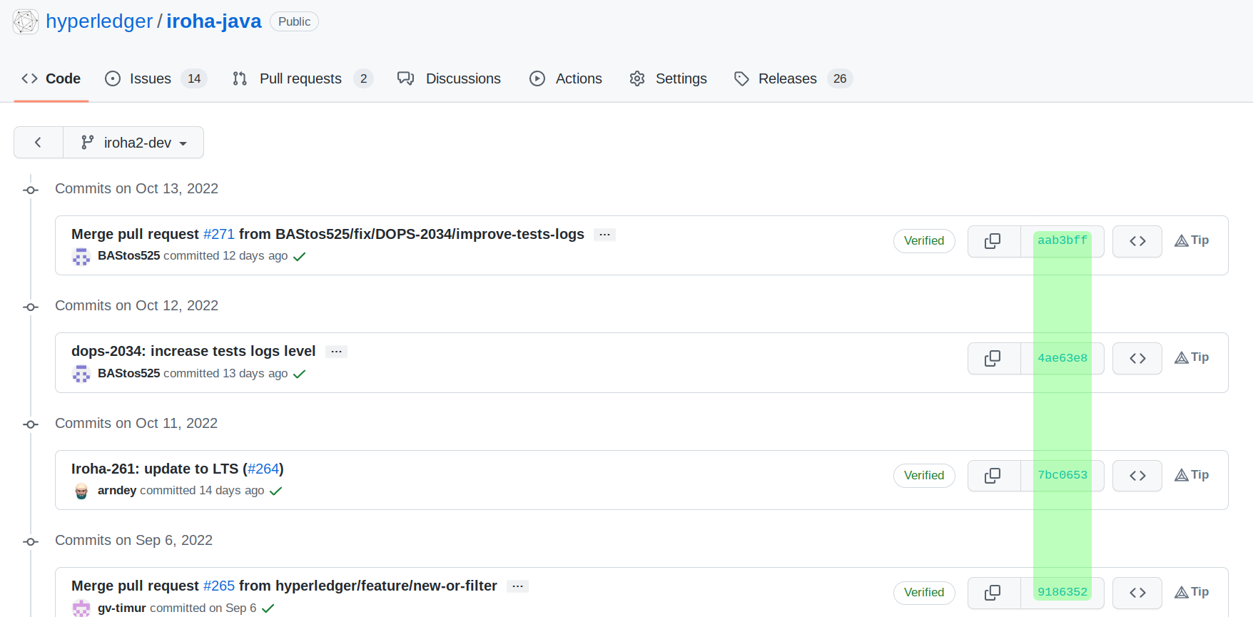 Snapshot versions match the Git commits. To get the latest snapshot, simply visit the iroha-java repository on the iroha-2-dev branch and copy the short hash of the last commit on the main page.